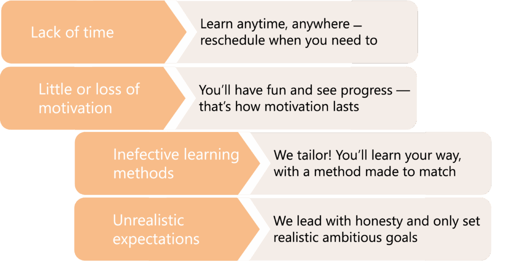 Finally, we remove the usual frustrations. Every question you have gets answered — no confusion, no guessing. And when it comes to speaking, you’ll get real, meaningful practice that builds confidence and fluency.